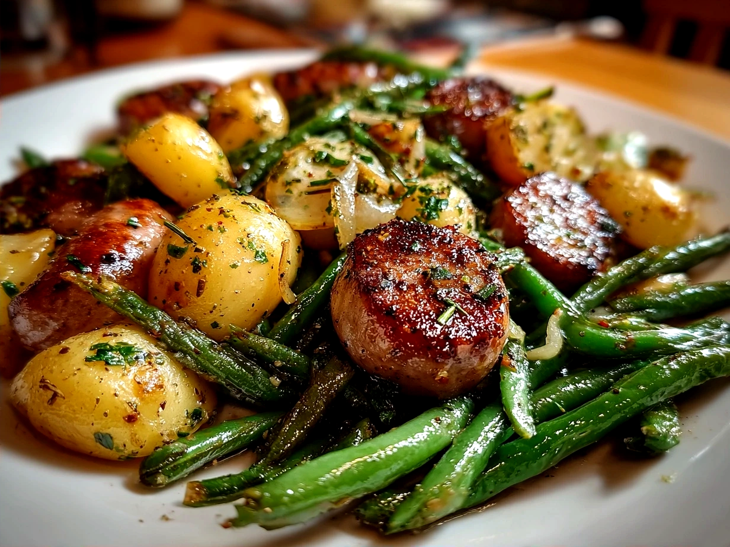 One Pan Sausage Green Beans and Potatoes served hot, showing sausage slices, roasted potatoes, and green beans