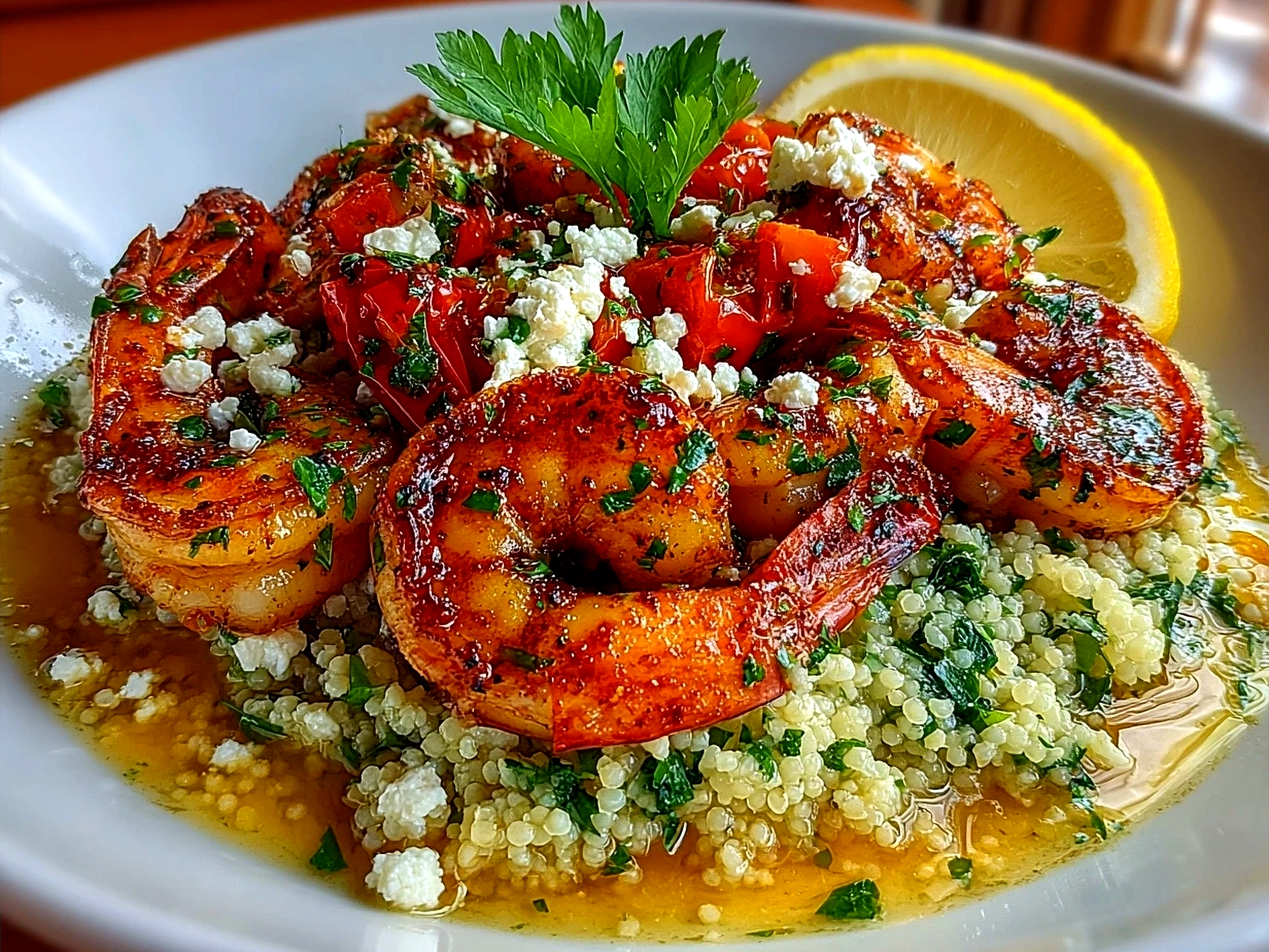- Plate your cooked quinoa or rice, then top with the shrimp and vegetable mixture. Garnish with extra lemon zest or parsley if you have it.