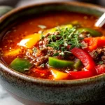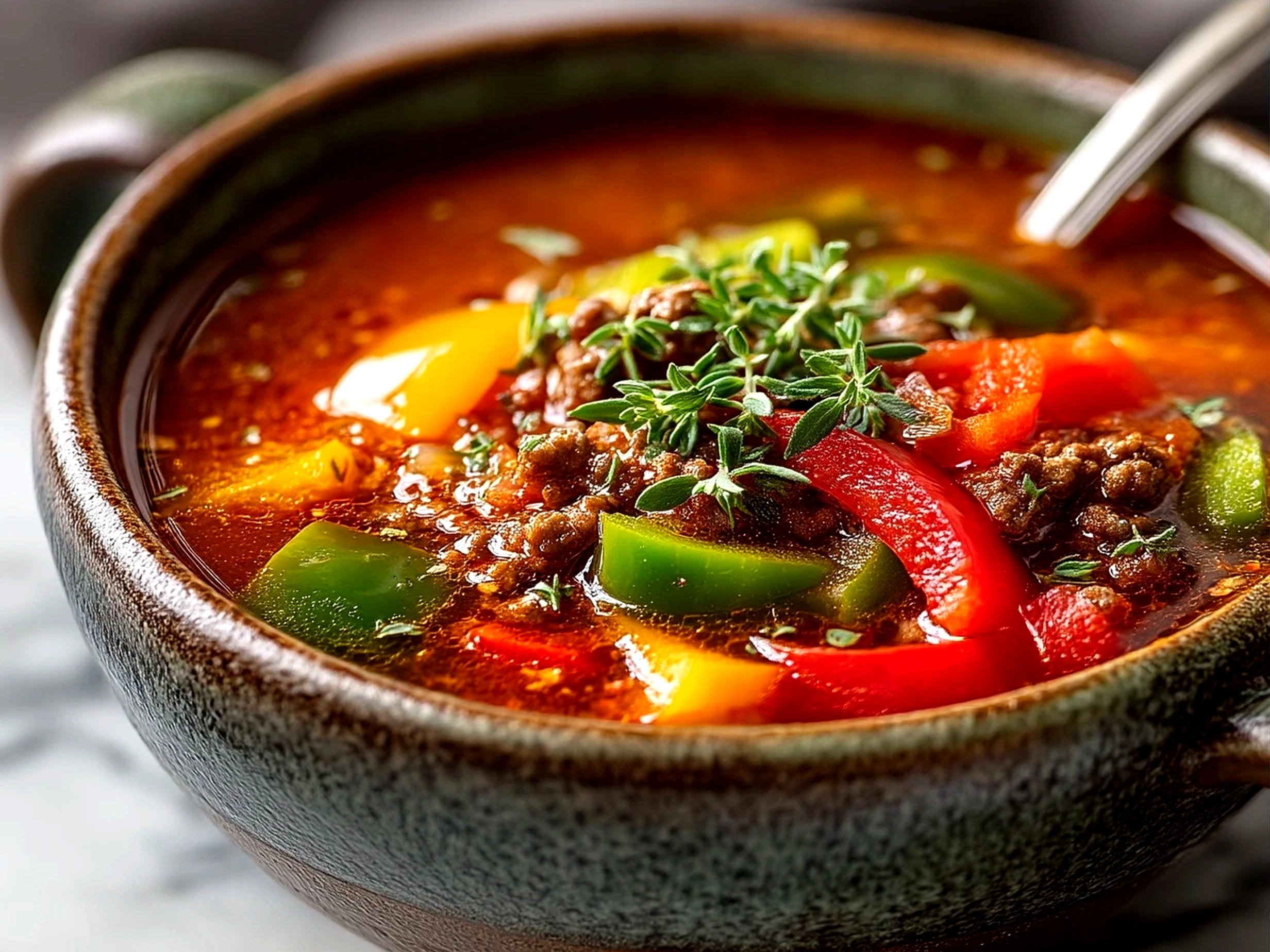 A hearty and flavorful soup inspired by classic stuffed peppers, combining ground beef, bell peppers, tomatoes, and rice in a comforting broth perfect for any season.